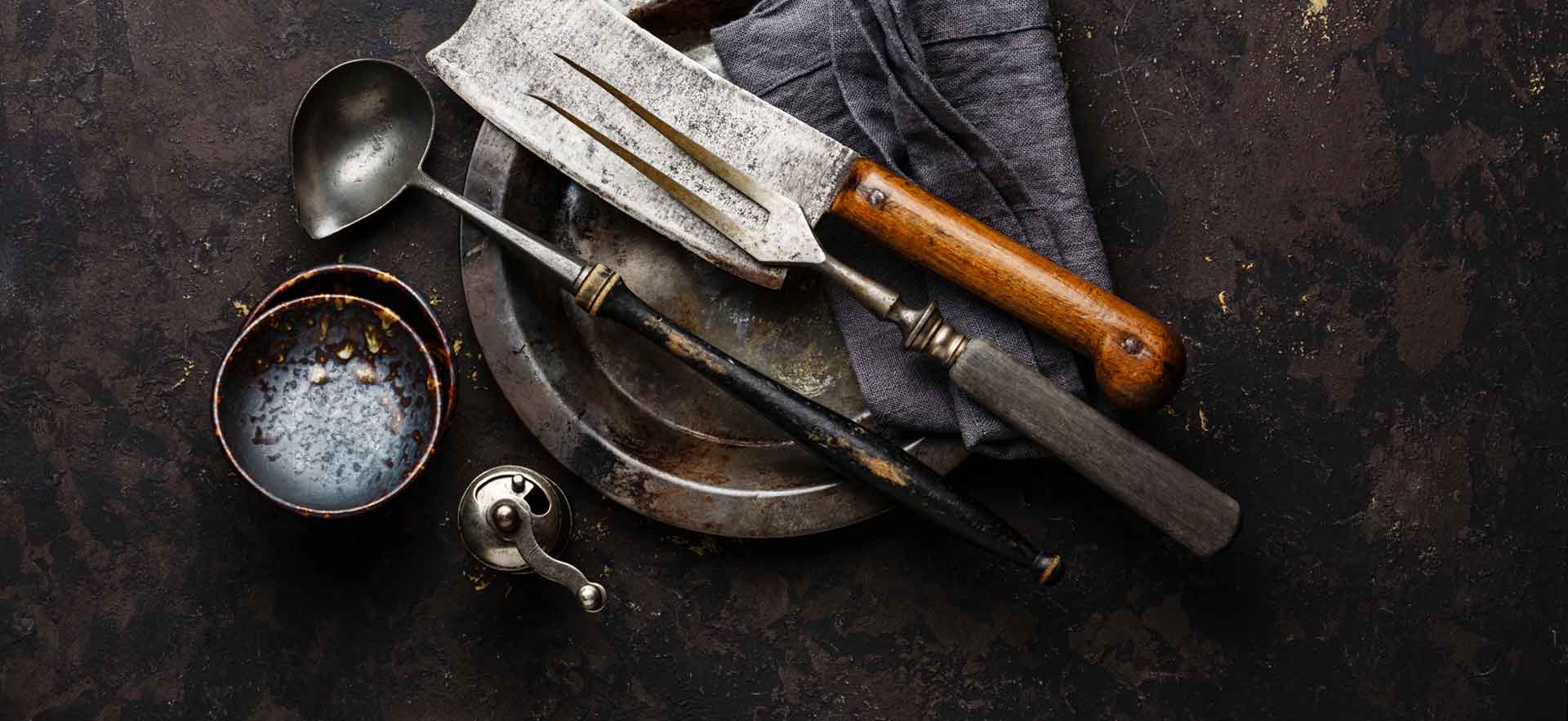 - Eyn hölzern Teller, irdene Becher, Krüge und Schälchen, ein scharfes Messer und nicht zuletzt eure Hände sind das Handwerkszeug, mit dem Ihr Euch die vielfältigst aufeinander folgenden Speisen und die überschäumenden Getränke einverleibet.